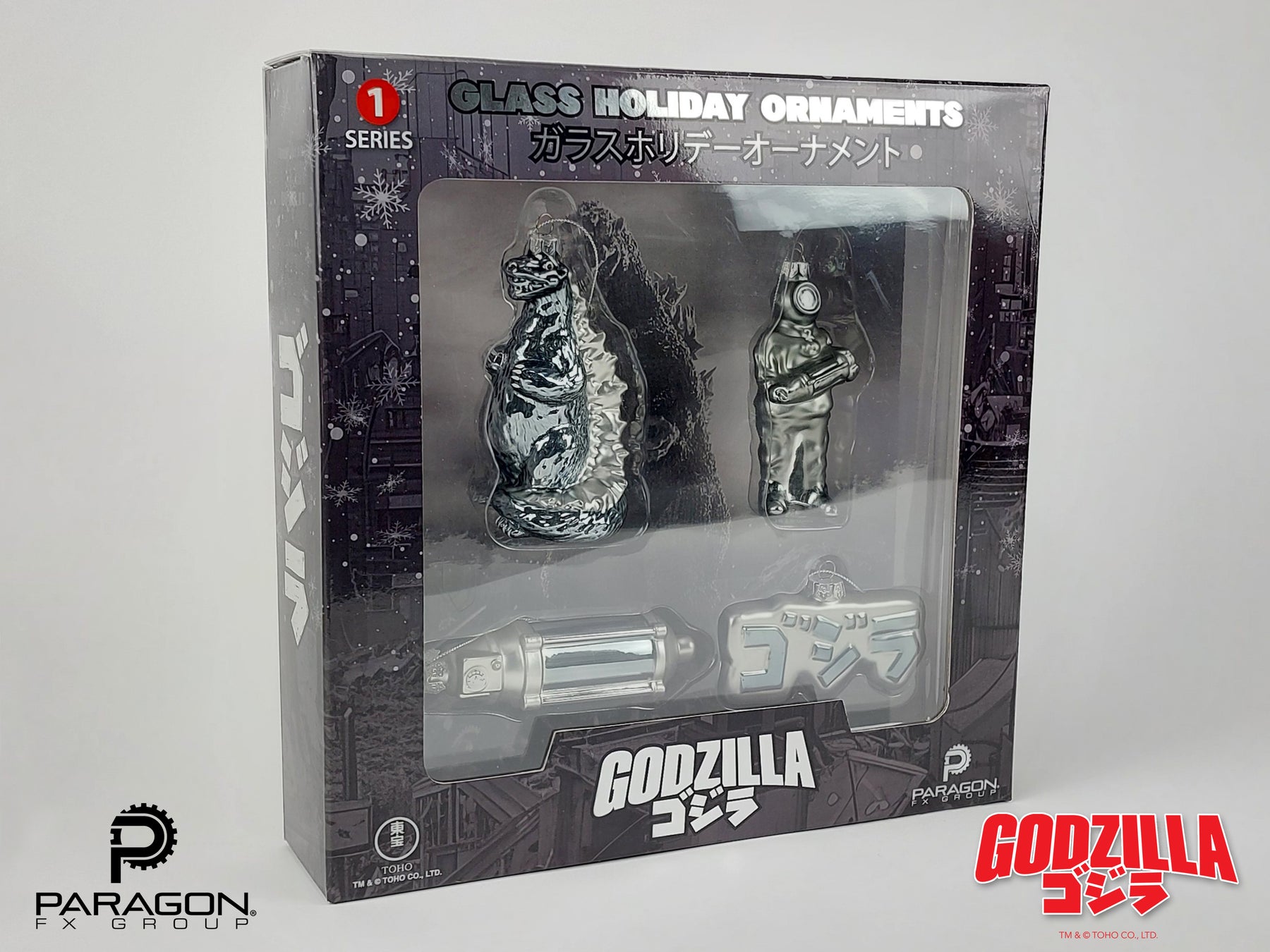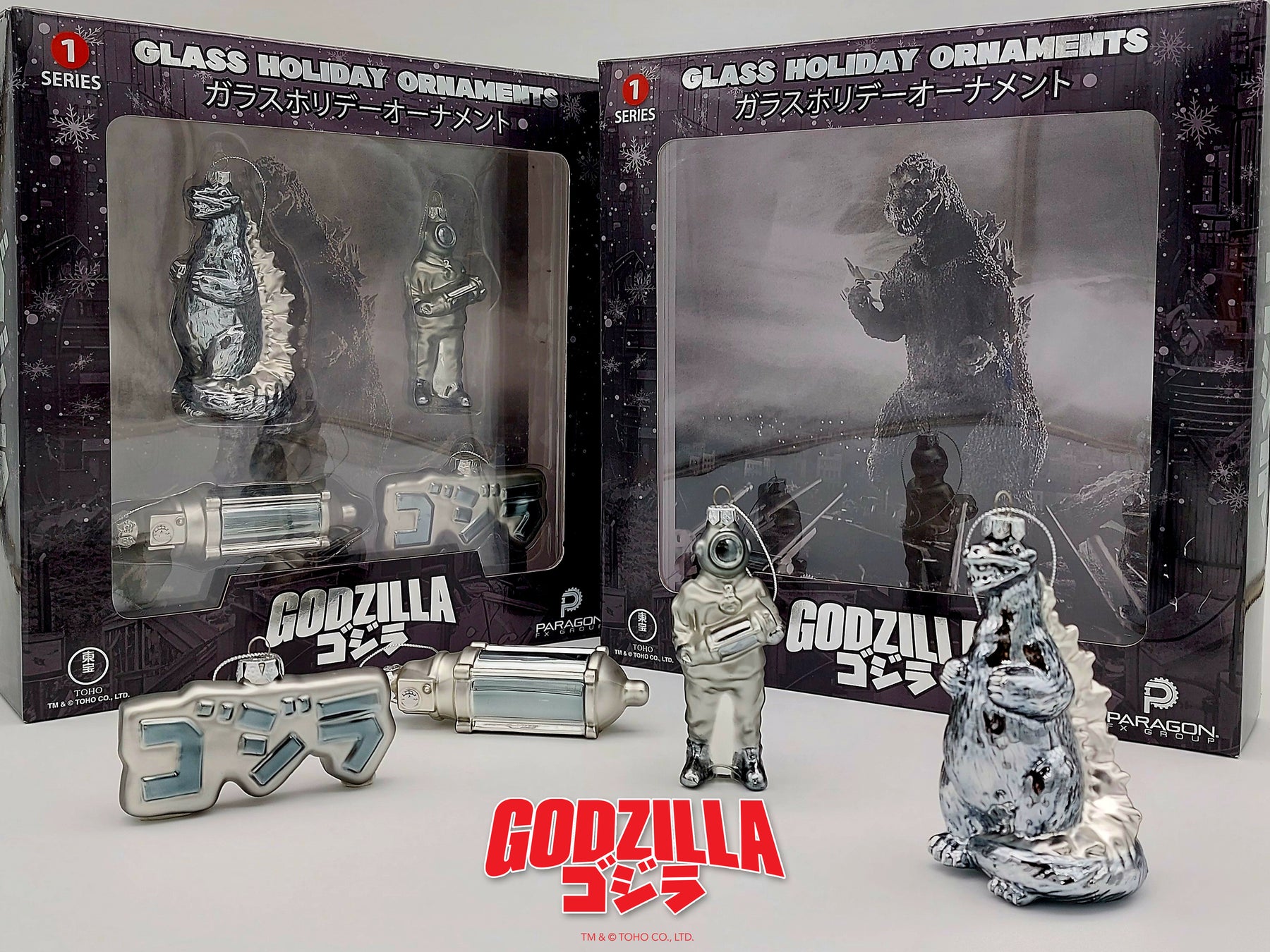 Celebrating TOHO Studios 1954 classic Godzilla, Paragon FX Group proudly presents this officially licensed set of glass holiday ornaments. This period-themed set includes, The Oxygen Destroyer, Dr. Serizawa, the original ゴジラ (Gojira) film title logo and of course, the King of the Monsters, Godzilla! Foil hits with subtle shading capture the spirit of the black & white era while box art pays homage to where it all began.